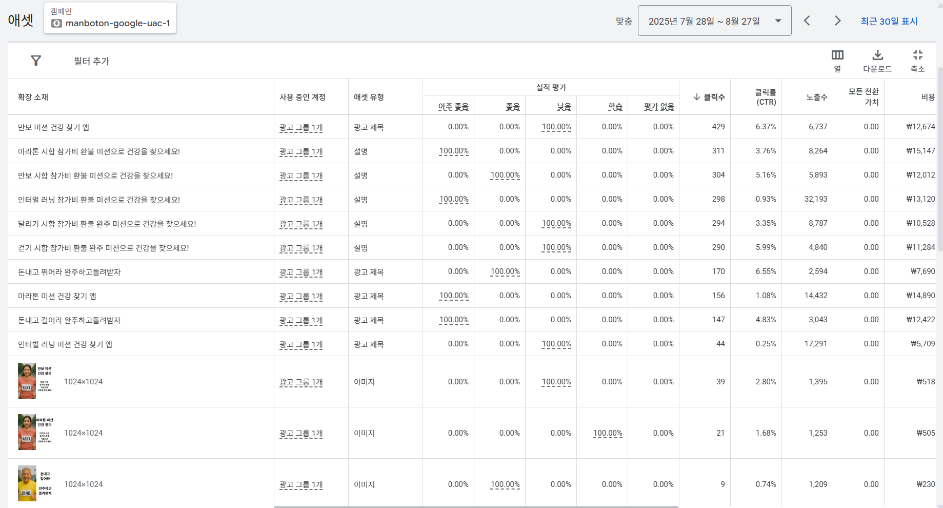다음은 만보톤 구글 앱 설치 광고(UAC)의 애셋(Asset)별 결과이다. 즉, 광고 소재별 결과로서, 이를 클릭수로 정렬한 것이다.