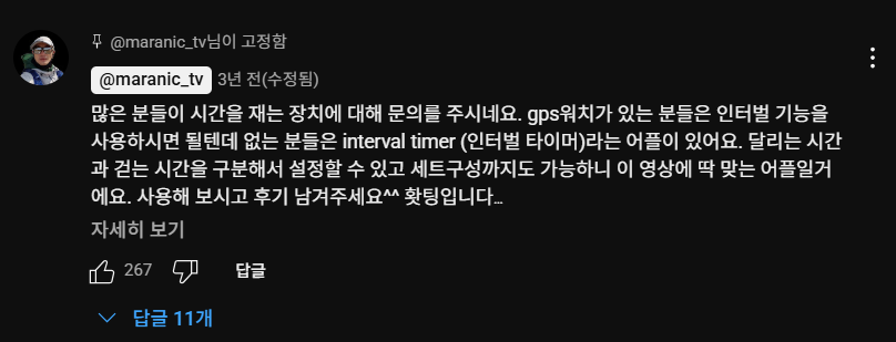 또한, 유튜브 채널 마라닉TV의 다음 영상의 유튜버 운영자 고정 댓글에 보면, 많은 사람들이 인터벌 타이머를 찾고 있다고 한다.