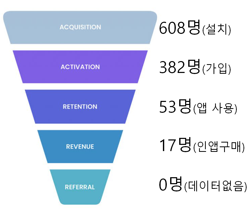 만보톤의 구글 앱 설치 광고(UAC) 한 달 운영의 결과를 AARRR 퍼널(funnel, 깔때기) 그림으로 나타내면 다음과 같다. 만보톤의 Acquisition은 설치수, Activation은 가입자수, Retention은 만보기로 한 걸음 이상을 측정한 사용자수라고 정의했다.