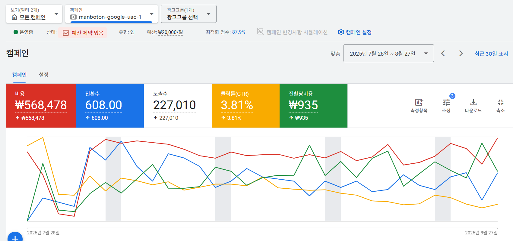 만보톤의 구글 앱 설치 광고(UAC)를 2025년 7월 28일부터 8월 27일까지 딱 한 달 했다. 정확하게는 31일 광고했다. 과연 결과는 어땠을까?